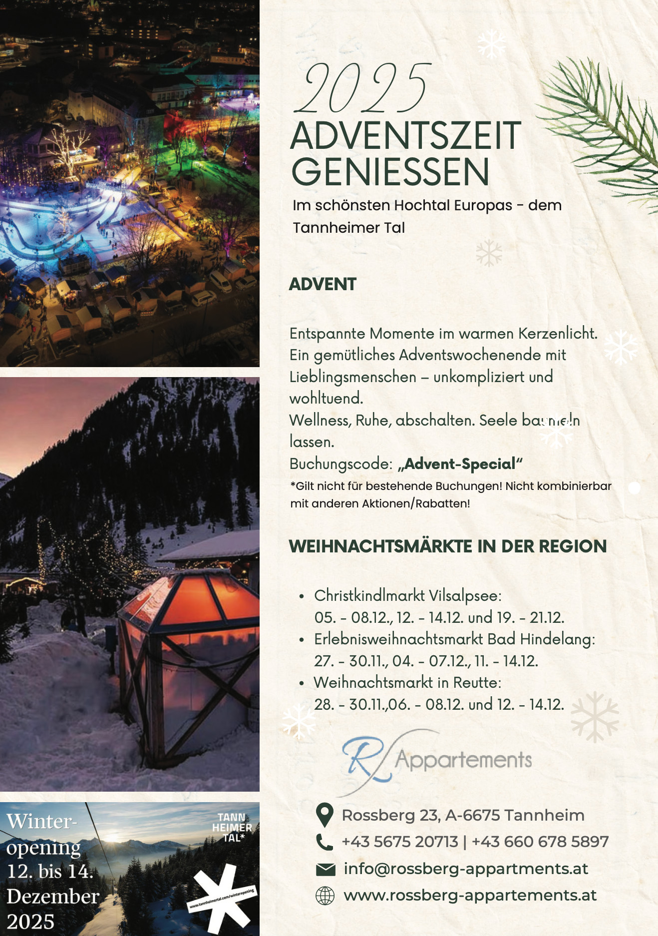 Mitten im Herzen des Tannheimer Tals erwarten Sie stilvoll eingerichtete Appartements der Rossberg Appartements. Von den Rossberg Appartements gelangen Sie nach 2,5 km zur Doppelsesselbahn, ideal zum Skifahren, Wandern und Radfahren.